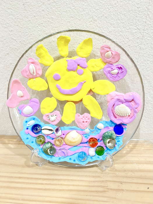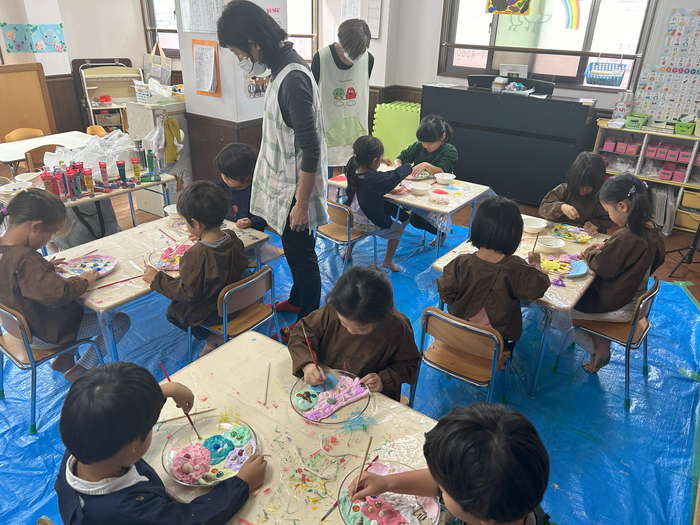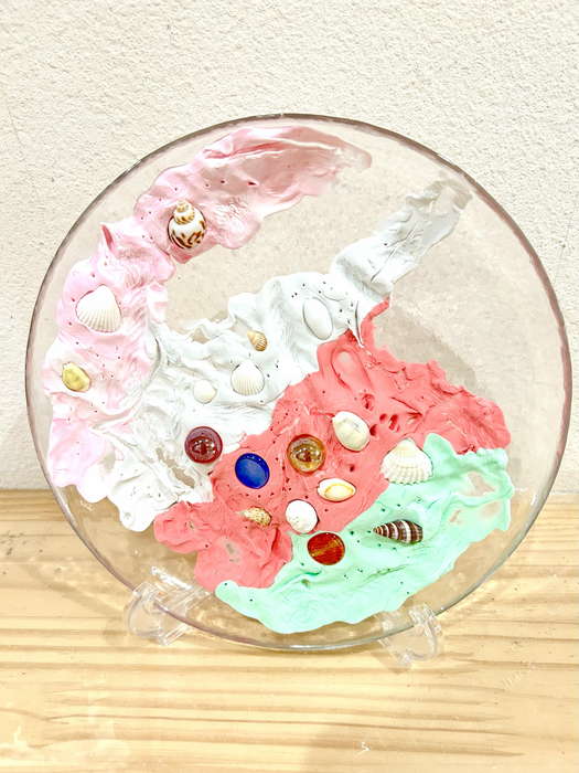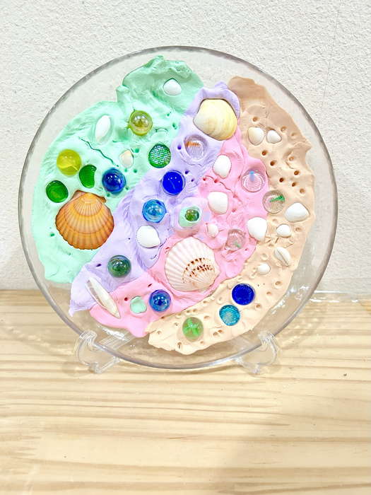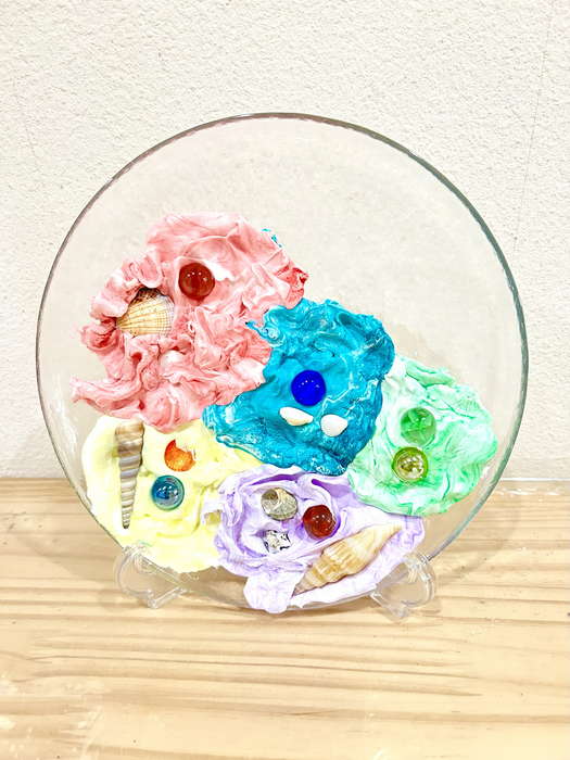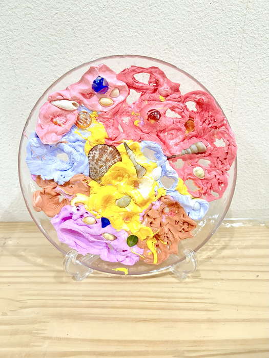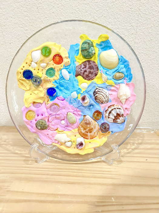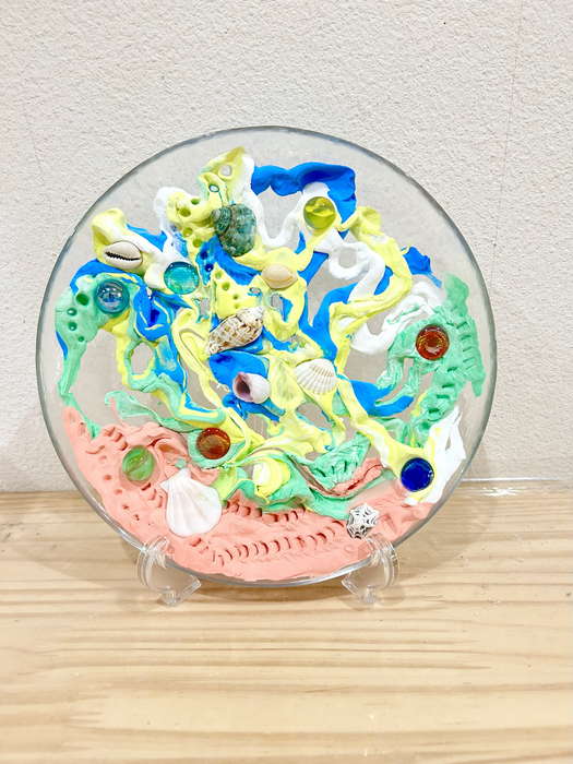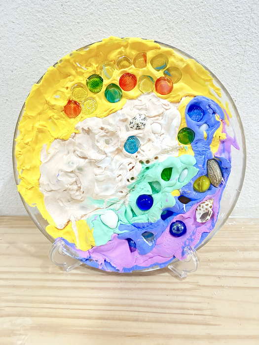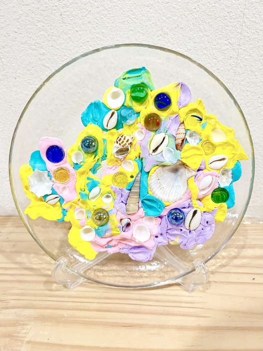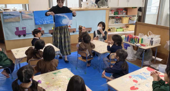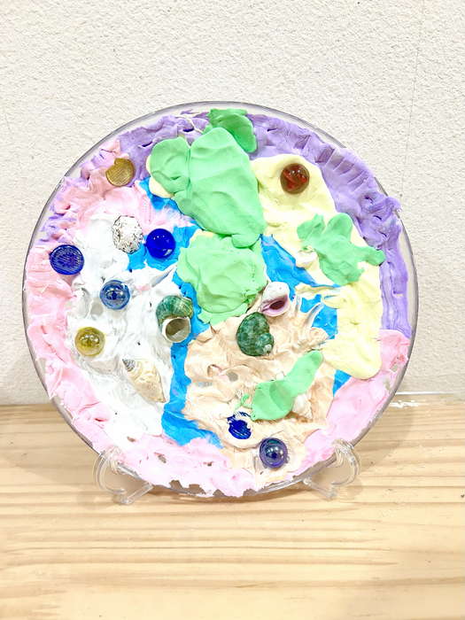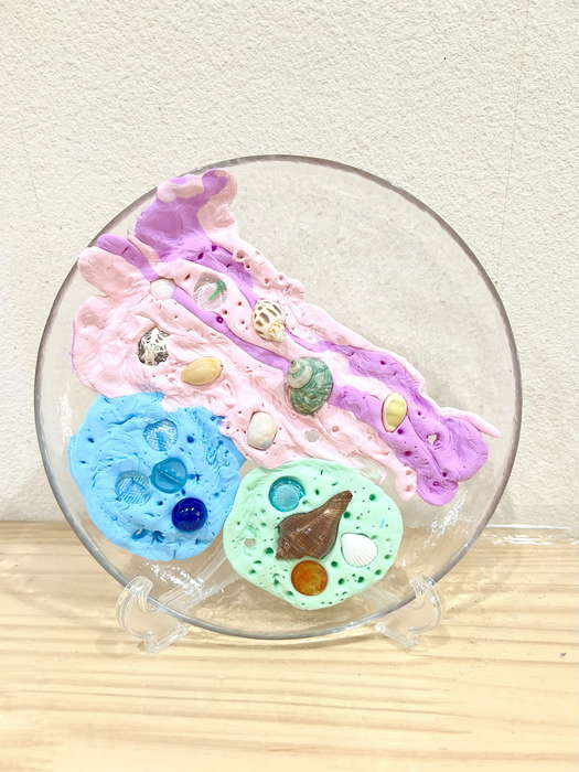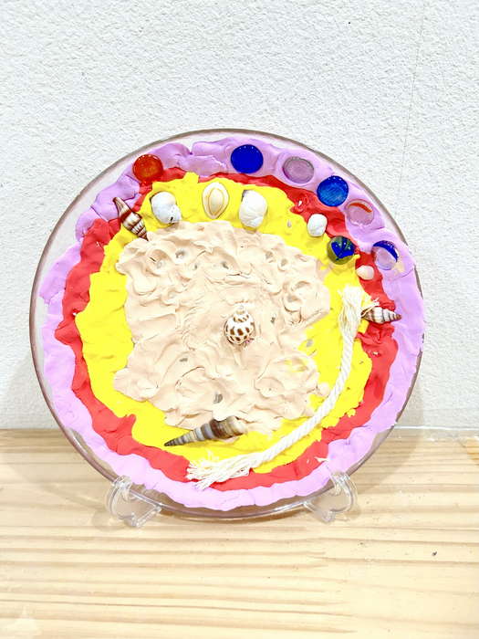 概要:海洋ごみや海の生き物について実際に触れて学んだことを振り返り、海のイメージを喚起するような画像を用いて導入をおこなった。具体的には、由比ヶ浜で見た海洋ゴミや海の生物たちの体験に触れながら「お魚さんたちはどんな海にすみたいかな?」「みんなはどんな海でくらしたい?」と問いかけ、自由にイメージを広げてもらった。今回は臨床美術のプログラムで海をテーマとした「シープレート」を実施した。制作中は様々な素材に触れながら、子どもたちが感じたことや守りたい海の姿について表現してもらった。作品は園内に展示し、保護者に子どもたちが感じたこと・学んだことを共有した。
