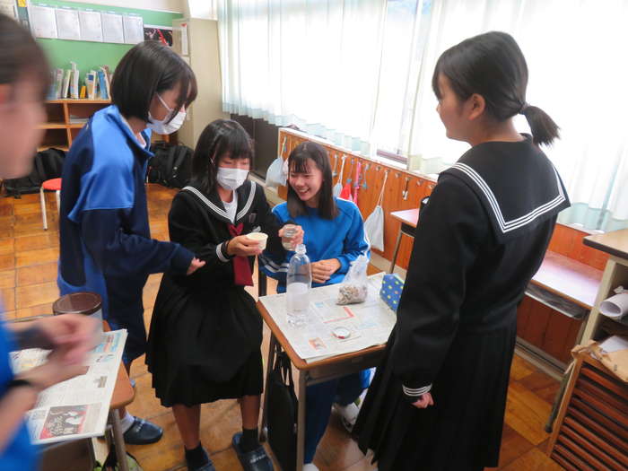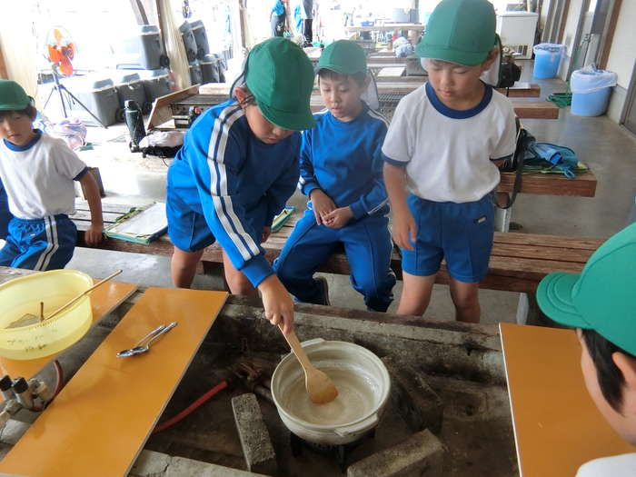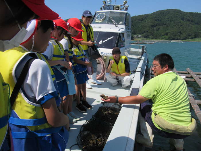 4年生は、3年時の2月から、学校の近くの藤田商店の養殖場でかきを養殖させてもらっており、その成長の観察を行った。また、海の食物連鎖の視点から、内外海の海にはプランクトンがたくさんいることについても学んだ。そこから山・川・海のつながりの学習につなげ、かきの養殖について学びを深めていった。