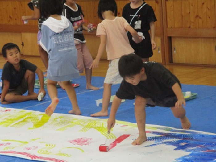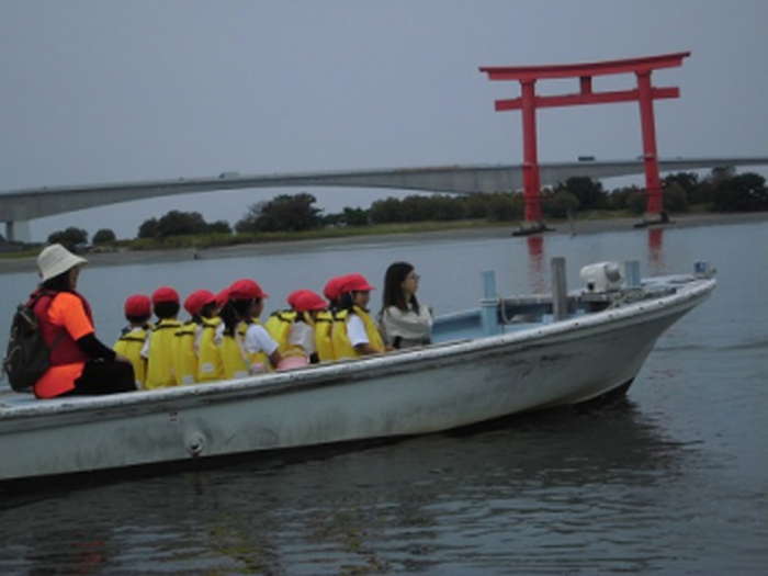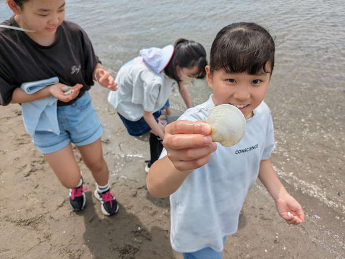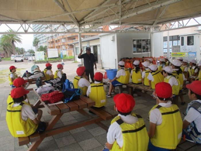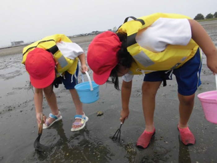 1年生は、浜名漁協弁天島遊船組合の協力で、船で浜名湖の中にある干潟「いかり瀬」に渡り、磯遊びや潮干狩り体験をした。磯遊びを通して、干潟の生き物を観察したり、海での安全な遊び方について学んだりした。1年生のうちから、身近な海と触れ合う体験を多く作っていきたいと改めて実感した。1年生は、その後、図工でロール紙に海の生き物を自由に描く時間を取り、海と自分がつながっている体験を振り返った。