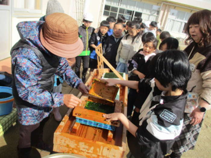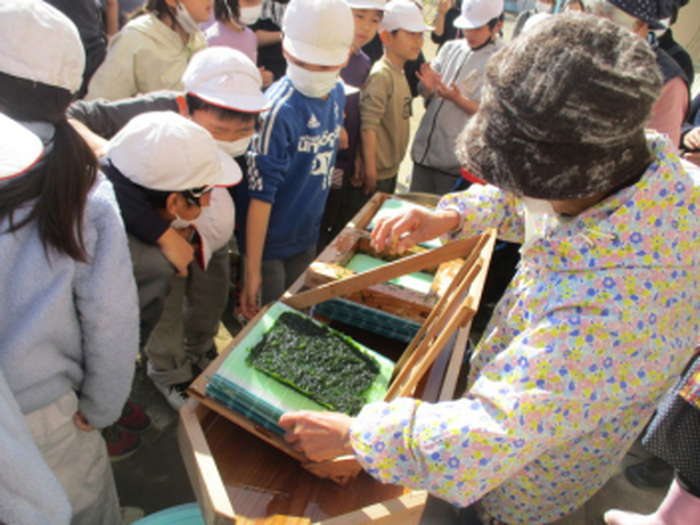 3年生も浜名漁協弁天島遊船組合の協力で、船上から浜名湖の自然を観察したり、ノリやカキの養殖場、漁港を見学したりした。その後、干潟「いかり瀬」に渡り、生き物観察をし、アマモ場の現状について話を聞いた。アサリやハマグリの生育状況についても教えてもらったりして、生物環境資源についての理解を深めることができた。また、冬には舞阪産の生のりを使って、海苔づくりを体験した。地元の名産を使って、おいしい板ノリが出来上がるのを間近で体験できて、よりふるさと舞阪を実感するきっかけとなった。
