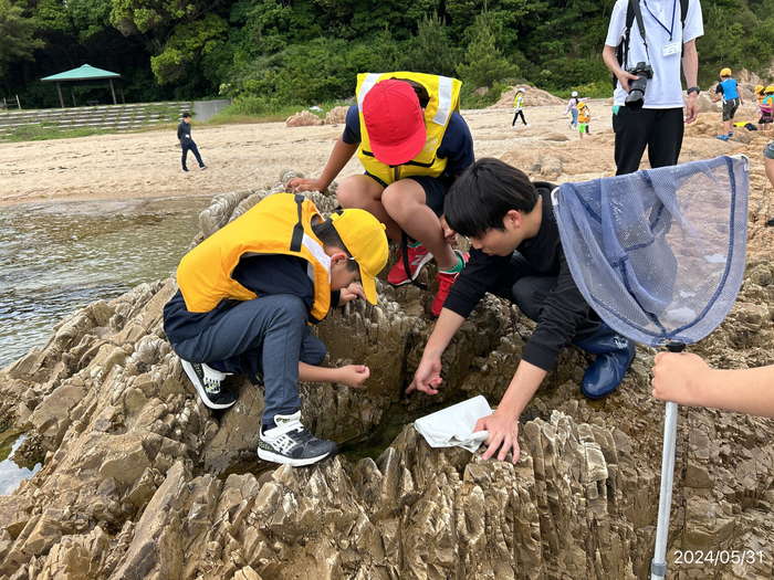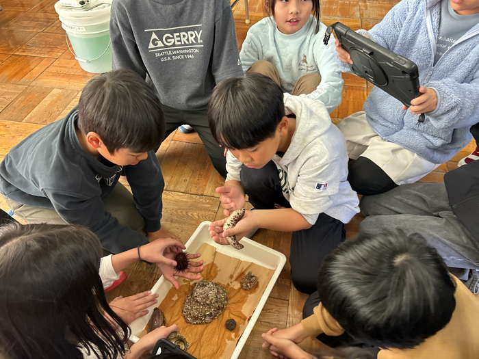 ・内容:令和6年度から実施、3~6年生(縦割り班活動…異学年交流)が三軒屋海岸(下関市長府)で磯遊びを行った。三軒屋海岸は美しい磯辺で、海の生き物がたくさん生息している。下関市吉見の水産大学校の先生・学生さんに講師を依頼し、児童が見つけた生き物をその場で名前や生態をおしえていただいた。