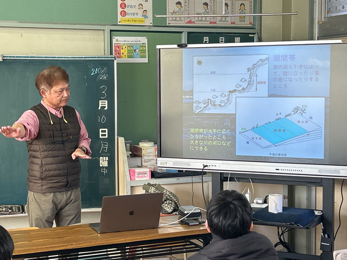 水産大学校の教授の荒木 晶先生が来校されて「川の生きものと水辺環境~川がつなぐ陸と海~」の出前授業があった。干潟は多くの生き物を育てる大切なエリアで、生き物が干潟に穴を掘ったりして耕したりして、干潟を養生させている。そのおかげで多くの生き物が生息し、アナジャコは地下6メートル下まで穴を掘ることがわかった。また「水の大循環」があり、水が海から山、そして川を通って海に流れていって循環していて、「水」の大切さを理解することができた。ます。昨年5月の「三軒屋海岸の磯辺の学習」では、荒木先生と学生さんに現地でたくさんのことを教えていただき、次回(令和7年5月)はこの海岸で体験学習を予定している。