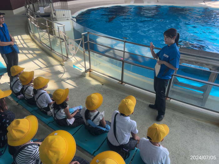 1年生は「イルカ」の学習。トレーナーの髙木さんから、イルカを見ながらイルカの話を聞いた。事前に質問を届けていたので、質問に答えていただきながらイルカの様子を学ぶことができた。ショーで使う道具やトレーニングの様子をすぐそばで見ることができた。