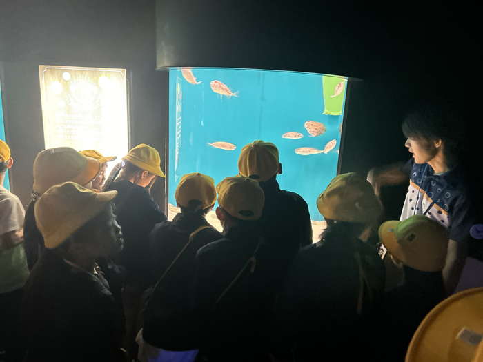 1・2年生今回はイルカの健康観察の見学で、獣医師の進藤英朗さんの話を聞いた。最初に血液検査があり月に1回血液検査をして健康状態を調べていた。人間と違って病気等のデータが少ないので、一頭ごとの個有のデータを毎回比較しながら様子を調べていくということであった。尾ひれ近くに針を刺して採血するが、動かずに採血できるように、尾ひれも持つことから少しずつ訓練を重ねて、採血できるようになっているということであった。