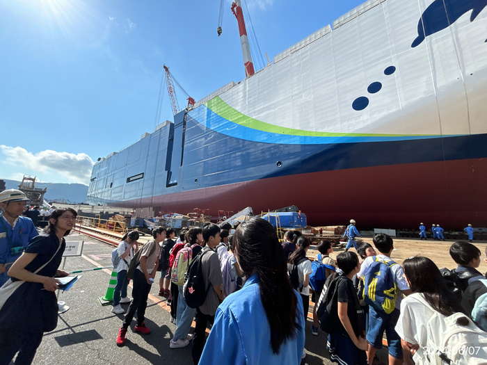 その後ヘルメットをかぶって工場見学があった。工場見学は撮影でなかったが、大きな鉄板が磁石式のクレーンで運ばれる様子やドッグの内側、組立工場など、ここでもびっくりするシーンがたくさんあり、とても勉強になった。2日前の事前学習を学校で行ったことの効果があり、当日は船や工場の様子を興味をもって見たり聞いたりすることができた。