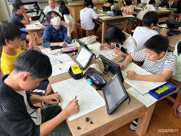 「瀬戸内デザイングランプリ2024」のための出前授業で、このグランプリは毎年開催し、山口県内の児童・生徒にポスターを制作してもらうことにより、デザインに興味を持ってもらいながら、構成力や判断力も養うことが目的であった。そのような子どもが育てば、山口県全体の美意識が高まり、地域活性にもつながっていくとことが主旨でこれからグランプリに向けて、ここで生み出されたアイデアをさらに磨いてデザインにして色をつけて作品に仕上げることになった。講師の方から最後までていねいに描いて色を塗るようにアドバイスがあった。作品は出品され、見事6点が入選した。