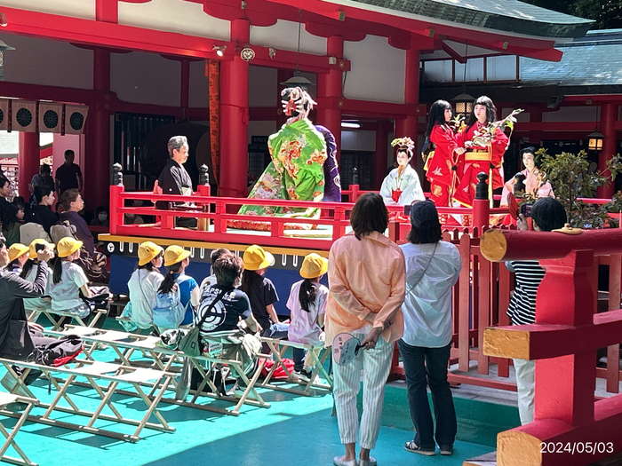 安徳天皇を祀る先帝祭を赤間神宮で見学、学校で上臈道中の花魁体験(下関舞踊協会)。