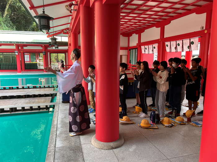 赤間神宮で宮司さんの講話など、壇ノ浦や関門海峡にかかわる歴史を体験や見学で学習。