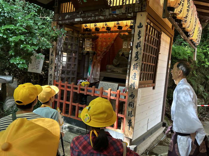 宝物殿には、平家や赤間神宮の歴史に関わる宝物がたくさんあり、詳しく説明していただいた。源平の戦いの屏風や掛け軸もあり、紅白に分かれて戦ったことや関門海峡の様子が描かれていた。続いて「平家一門之墓」に行き、7基ずつ2列の14基のお墓が並んでいた。お墓の側には耳なし芳一の「芳一堂」がありお墓と芳一の物語がつながりがわかった。最後に本殿を見学し本殿前には水が張ってあることや神事の時には橋でつながることがわかった。宮司さんからとてもわかりやすく教えていただき、普段は入ることができないところに案内していただくなど、貴重な学習をすることができた。
