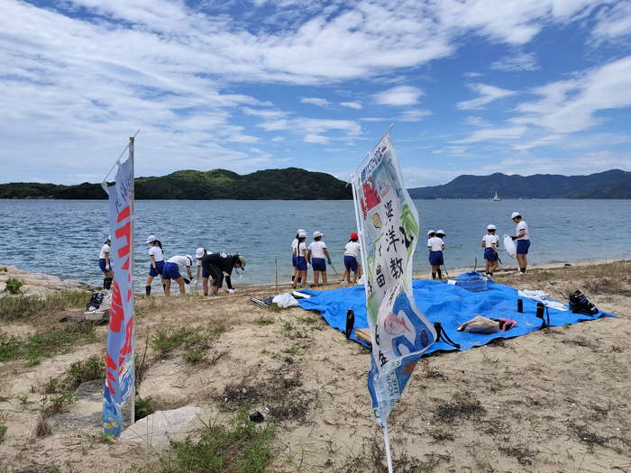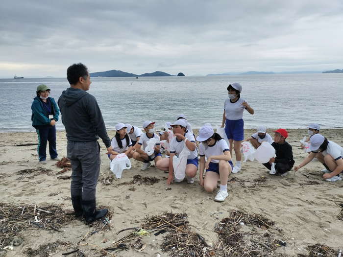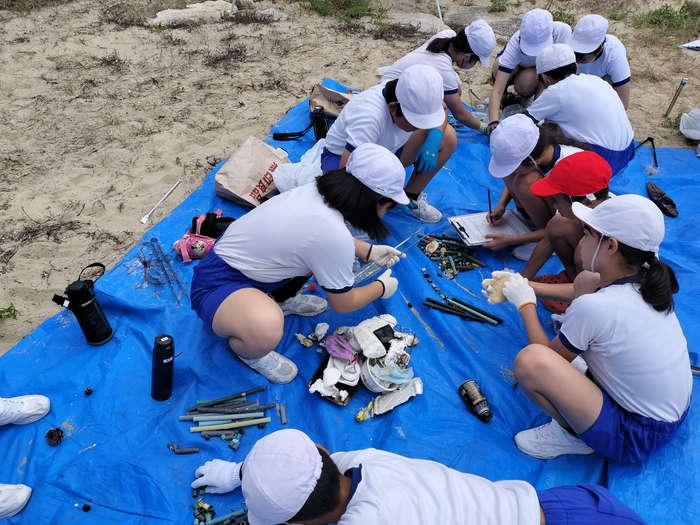 3,夏の海水浴シーズンを前に、地元海水浴場の清掃活動とごみ調査を行って、海のごみが何処からやってくるのかを考えつつ、汀線付近延長10mの海岸の全てのごみを集め、種類と個数をカウントした。またマイクロプラスチックについての採集体験を行って海の環境保全の必要性を学習した(写真3,4参照)。