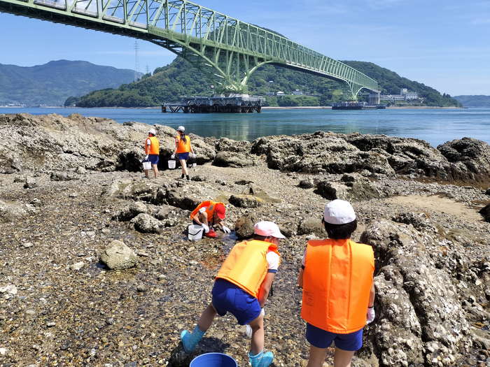 2,学校の近くにある磯に出かけ水族館飼育学芸員を講師に、磯に棲む生物を観察し、魚介類や海藻類の生物指標により付近海域の水質と豊かさを学習し、機器不要の手法により判定する事が出来る事も合わせて知る事ができた(写真2参照)。
