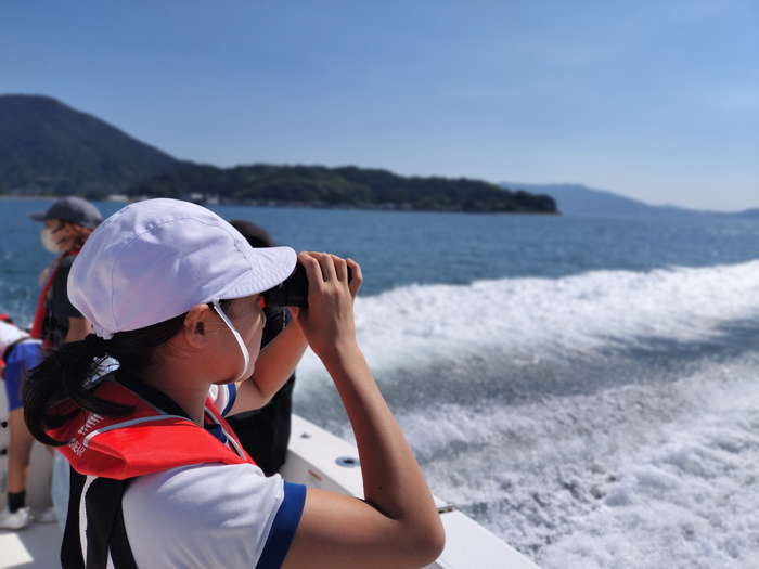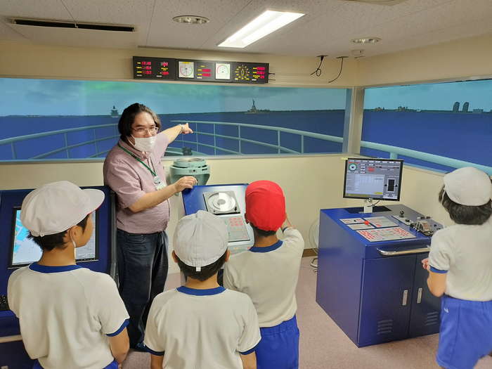 4,学校の眼下に広がる強潮流で名高い大畠瀬戸があるが、日頃はほとんど意識することない事から、商船高専の実習船に乗り、潮流の激しさを直接体感し、一定距離を流れて行く時間を計測しその速さを算出した。航走しながら双眼鏡を使って浮遊ごみを確認した。また水温や透明度の観測も行って地域の海洋環境について学習した。さらに校内施設の見学も行い航海シミュレーターにより、ニューヨーク港がスクリーンに映し出され、児童は舵輪を握って操船実習を行った(写真5,6参照)。
