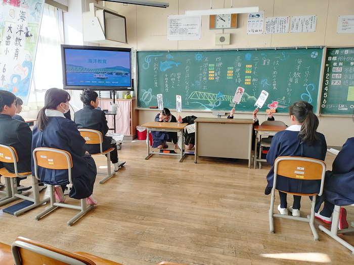 5,以上の学習を取りまとめて保護者、地域住民そして部外講師等に対し、海で学習した事について発表会を行った(写真7参照)。