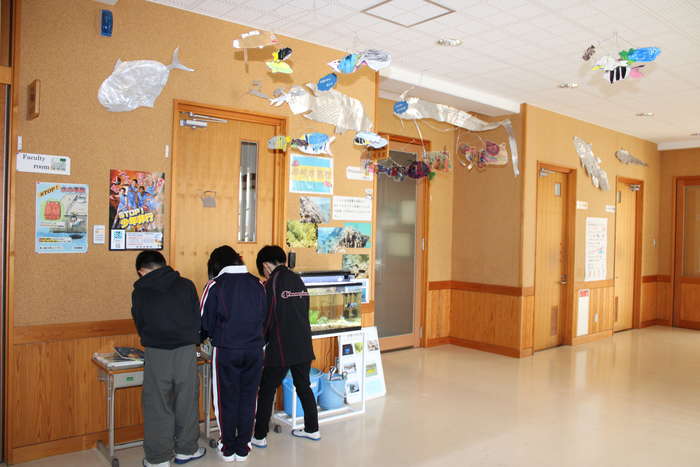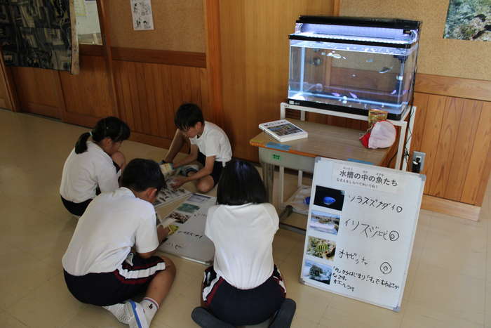 町内の磯に住む生物を飼育している。磯の生物や海水魚の関する書籍、飼育している生物等の紹介コーナーをつくり、児童が興味・関心を持ちやすい環境づくりを行った。また、学年と連携し、図画工作科で作成した「飼育している魚」や「新種のおしゃれな魚」の作品をモビールにして牟岐水族館のコーナーに掲示している。