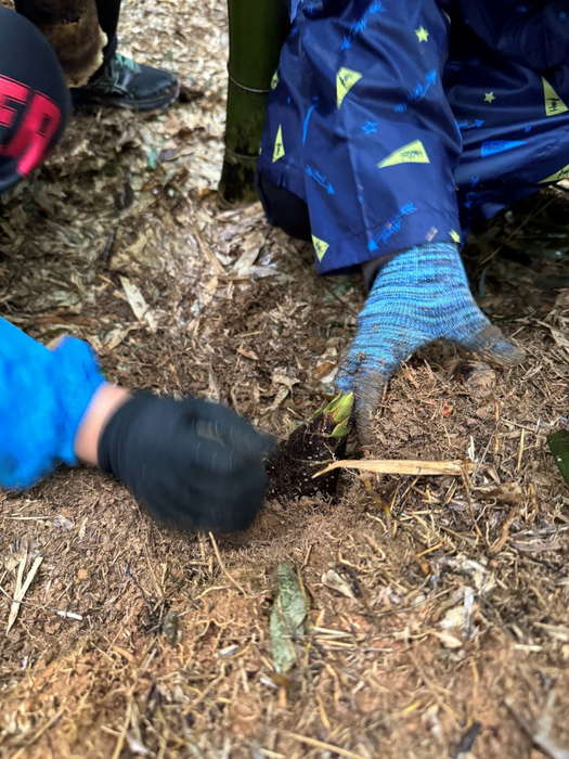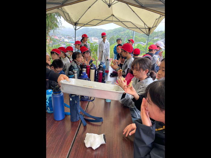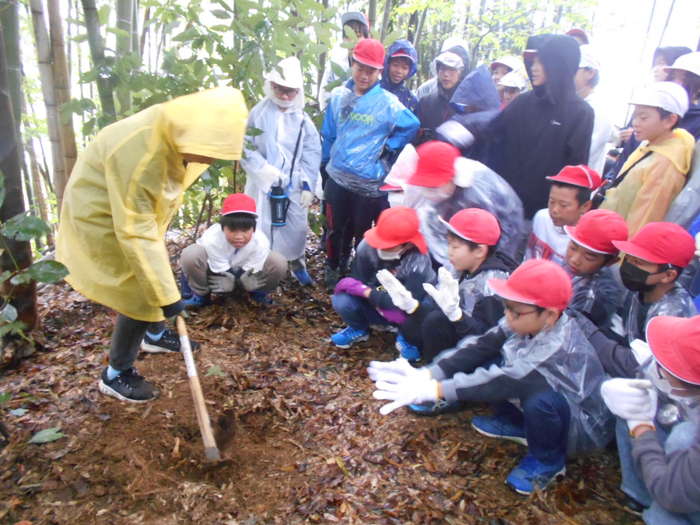 校区の森林調査を行い、放置された竹林は土砂崩れなどの原因になっていることや、竹林の根は浅いため、山崩れの原因になり、広葉樹の森林と比較して、土壌の栄養が少なく、山の環境、さらには海の環境に影響を及ぼしていることを知った。一方で手入れされている竹林は、竹の香りがして心が落ち着き、静かで心地よい空間になっているという違いを実感した。そして、実際に竹を切って竹の丈夫さを実感したり、タケノコを掘ったり、校区に自生する野草を食してみたりして、校区の豊かな自然を守り、竹の良さを生かしたいという思いをもった。