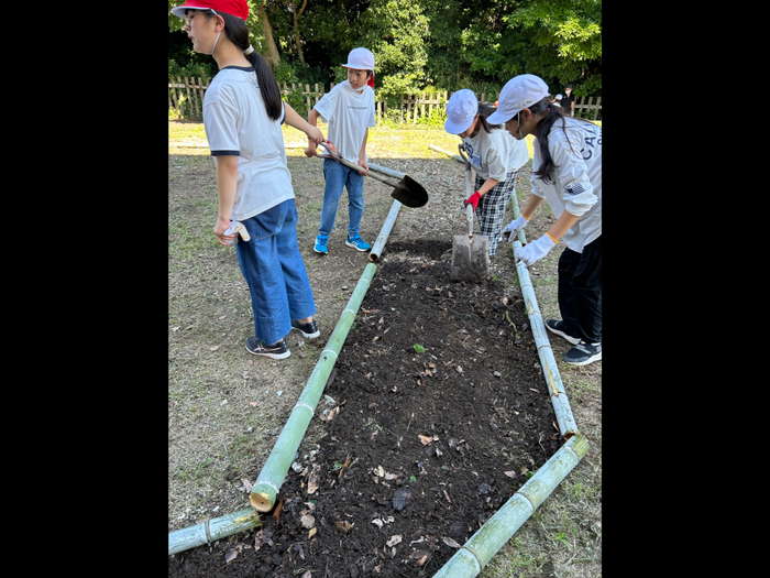 そこで、学校の敷地の中に、竹炭を埋めて作った道路や、野草などを植えたコーナーを作り、「バンブーガーデン」と名付けた。天の原小学校の他の学年にも、竹の良さや、野草などの自然の良さを感じてもらうことで、校区の自然環境を守ろうという意識と、愛着を持ってもらえるようにしたいと考えた。
