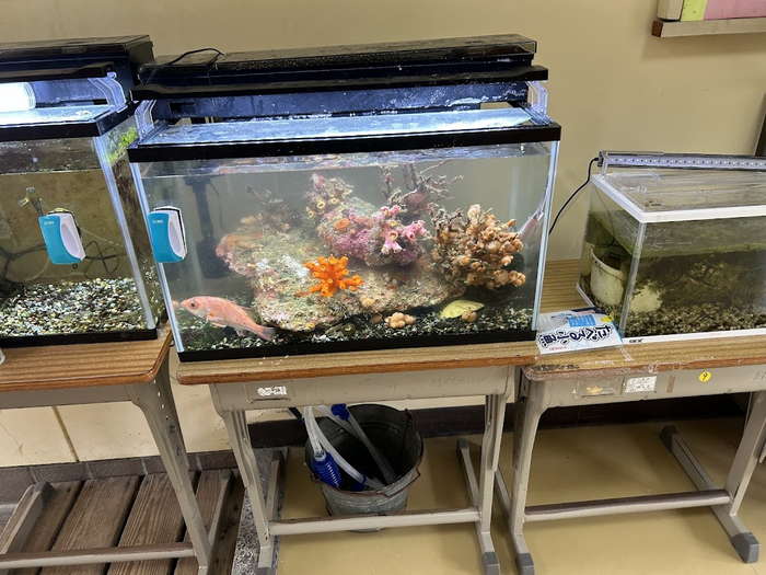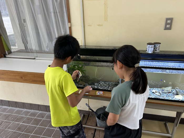 3・4年生の総合では、5月から9月まで、佐須奈港の防波堤や漁船に乗船して、生きもの調査を行った。佐須奈港の防波堤では、ベラ、カサゴ、メジナなどを釣ることができた。その折に、佐須奈漁協に30kgを越えるイシナギやウッカリカサゴ、アマダイ、チカメキントキダイなどが水揚げされている様子を見学した。沿岸域での生きもの調査に興味が向き、保護者や漁協青年部の協力もあって、漁船に乗船して調査した。カサゴやアカハタ、フエフキダイ、ベラを釣ることができた。さらに、捕獲網を使って、河口の汽水域で捕獲調査を行い、クツゾコやヤドカリなどを捕獲し、現在も水槽で飼育・観察している。これらの活動をもとにそれぞれの関心に基づいてまとめ、11月の校内文化祭や海洋教育を進めている福岡市、宗像市、五島市の小学校とも遠隔交流学習を行い、対話力を高めることができた。