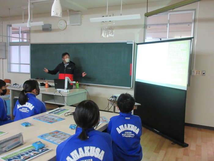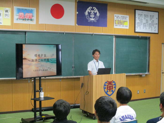 (1)総合的な学習の時間で、講師を招いて「環境学習~海洋ゴミ問題~」をテーマに講話を聞いて学ぶ。(写真(1))