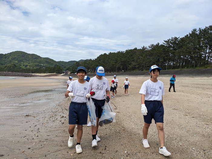 (2)総合的な学習の時間で、校区にある白鶴浜の清掃活動を天草小・中学校合同で行う。(写真(2))