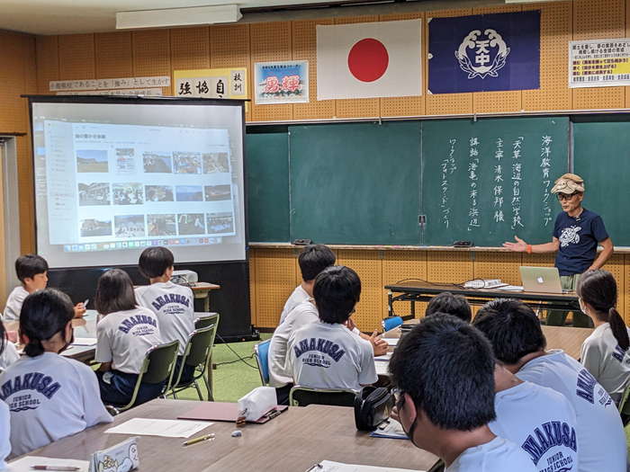 (4)総合的な学習の時間で、天草漁業協同組合から講師を招き、「天草町の漁業について」をテーマに講話を聞き、その後実際に海上で作業の様子を見学する。