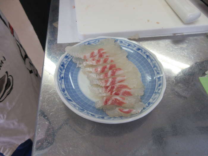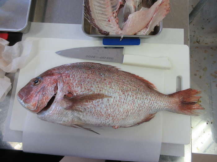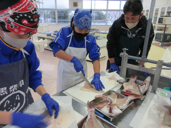 (5)総合的な学習の時間で、熊本県海水養殖漁業協同組合から講師を招き、「お魚教室」を行い、海の環境と産業について学ぶ。(写真(4))