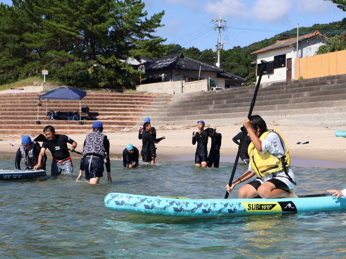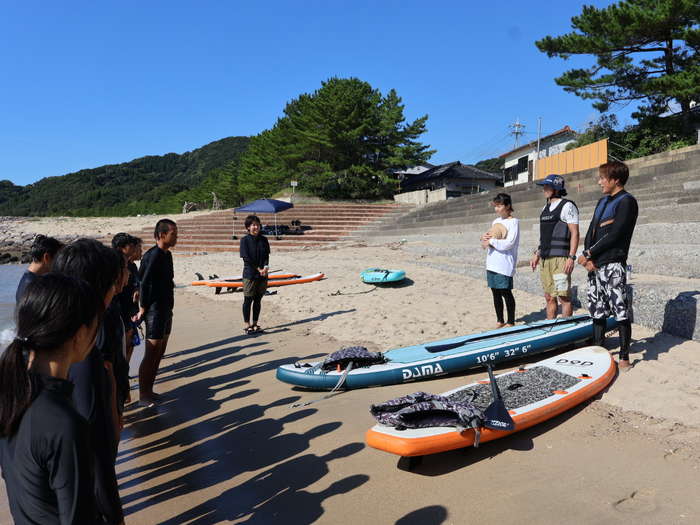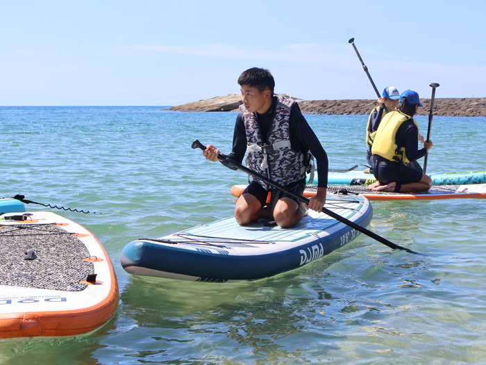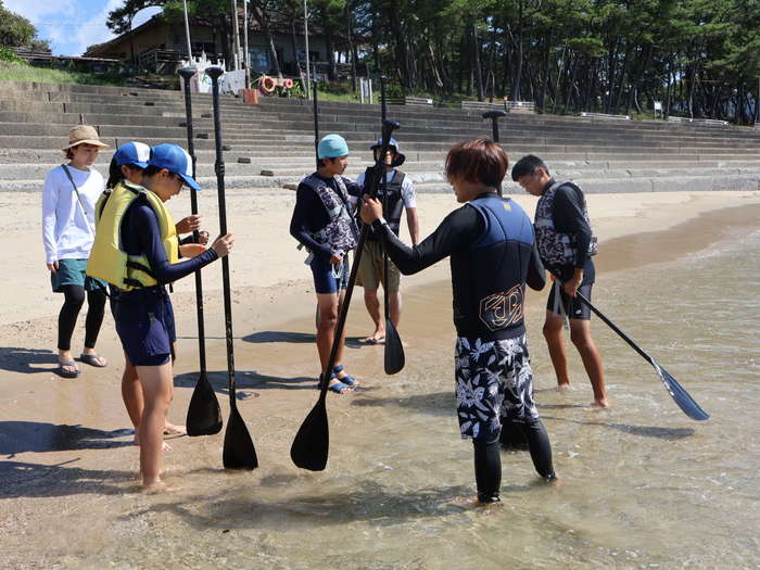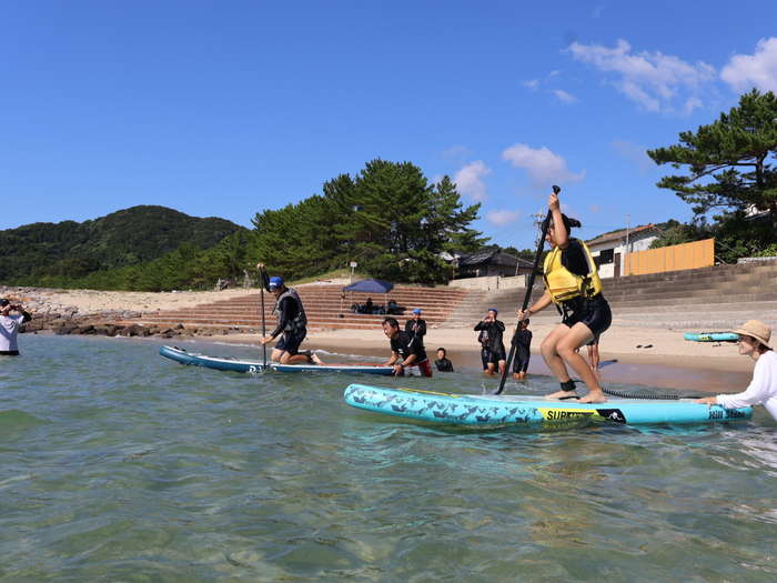 (4)総合的な学習の時間でのマリンアクティビティ(サップ体験)を通して、海のよさや現状を学ぶ。(写真(5))