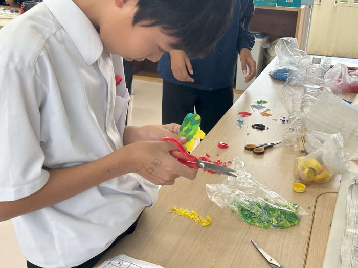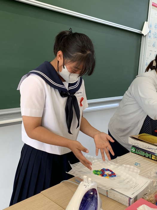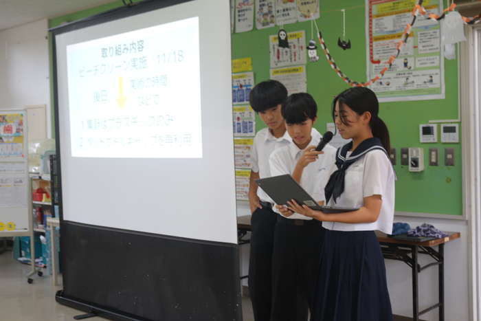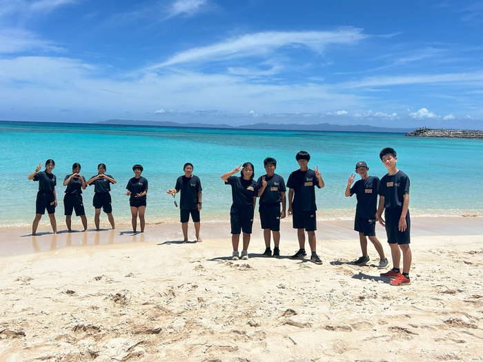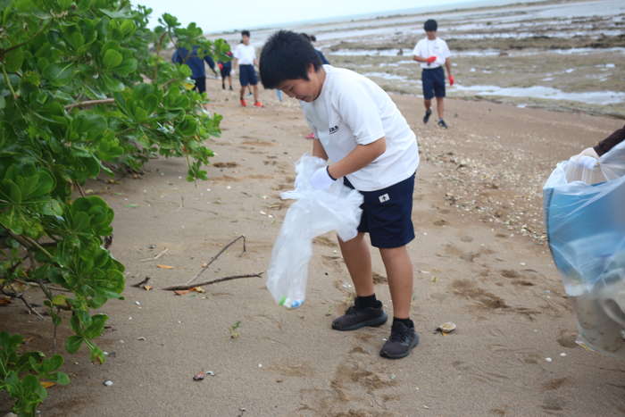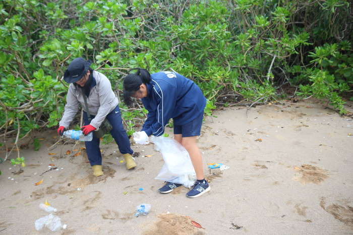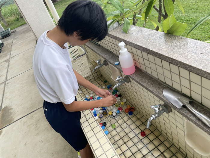 仲間岬でビーチクリーンに取り組んだ。今年度は、ゴミを資源として考えようと生徒会を通して発信し、ペットボトルのキャップをアップサイクルして、西表島をイメージしたキーホルダーを制作した。