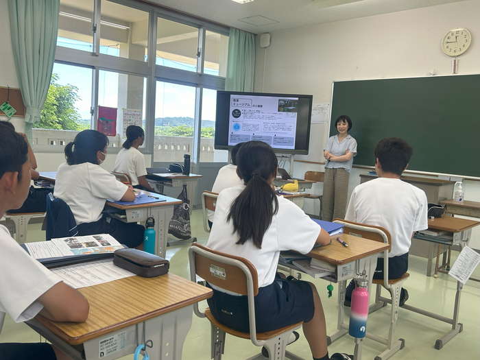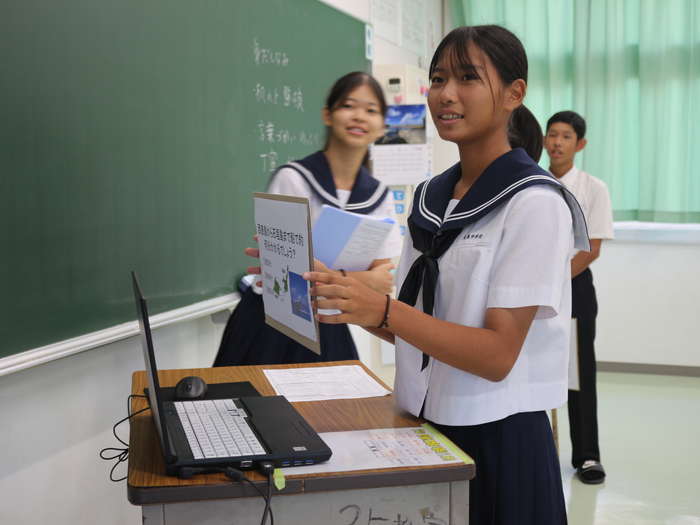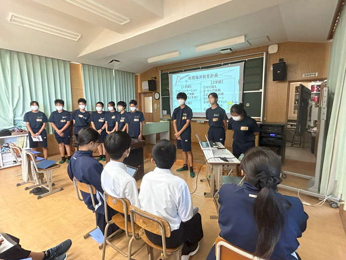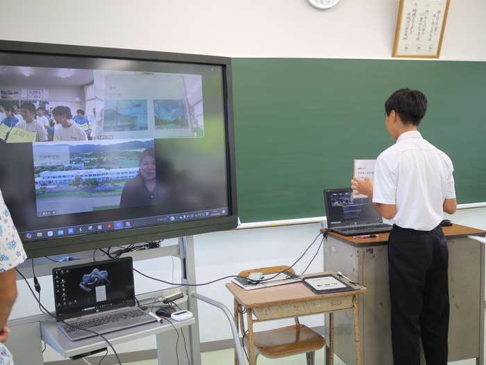 東日本大震災で甚大な被害を受けた地域にある階上中学校と、世界自然遺産に指定されている西表島にある大原中学校をオンラインで結び、他県の海洋教育等の取組を知る機会を設定した。積極的に交流を図る中で、互いに海や地域への思いや考えを発表する良い機会となった。
