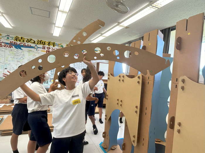 東海大の渡辺友美先生のご協力のもと、海の恵みをいただきます!展(段ボール博物館)を視聴覚室に設置し、海に関する学習だけではなく、自分が伝えたいことを表現する方法を考える体験学習を行った。