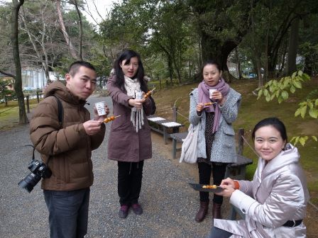 第4回招へい 『iRead 壹読』 訪日取材班 第4回招へいは2013年2月26日から3月5日までの日程で『iRead 壹読』訪日取材班4名を招へいしました。26日から3月1日までは東京にて取材し、3月2日から3月5日までは京都・大阪での取材活動をおこないました。写真は金閣寺売店前でおだんごを食べている取材班の様子。 左から呉久久(編集担当)、靳錦(文化記者)、莫静清(時事記者)、李慶雅(文化記者) |