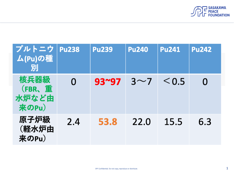 表 2:原子炉のタイプごとの抽出プルトニウムの組成